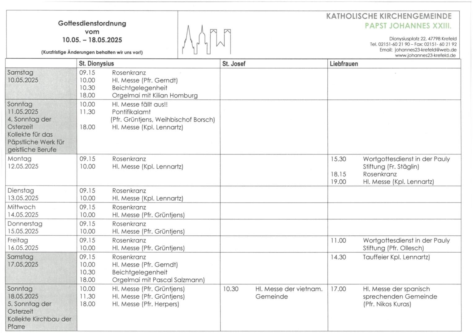 Um den Pfarrbrief von Papst Johannes XXIII. Krefeld kostenlos per E-Mail zu erhalten, tragen Sie Ihre E-Mail-Adresse ein und klicken auf 'Pfarrbrief abonnieren'.